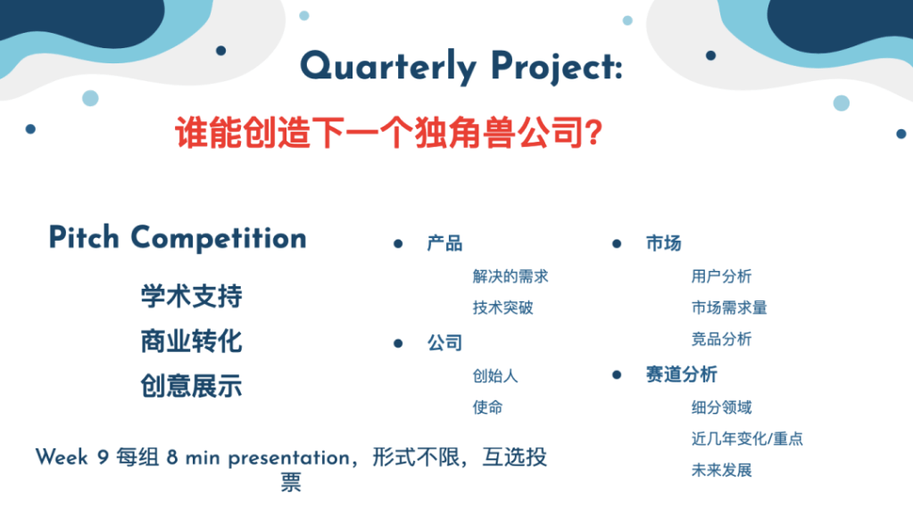 InT@UCLA 的首个 Quarter Project 以 Biotech StartUp Pitch 为主题,激发了大家的创业热情,引导大家练习文献搜集,领域研究和编写 deck 的技能。